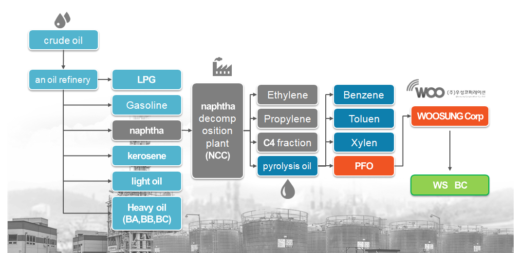 Woosung produces the best quality of fuel oil through vacuum distillation. Our WS B-C is efficient with high caloric value and eco-friendly with low sulfur and nitrogen contents. Also, Woosung, the official agent of LG Chemical, stably supplies C9+ to various customers.